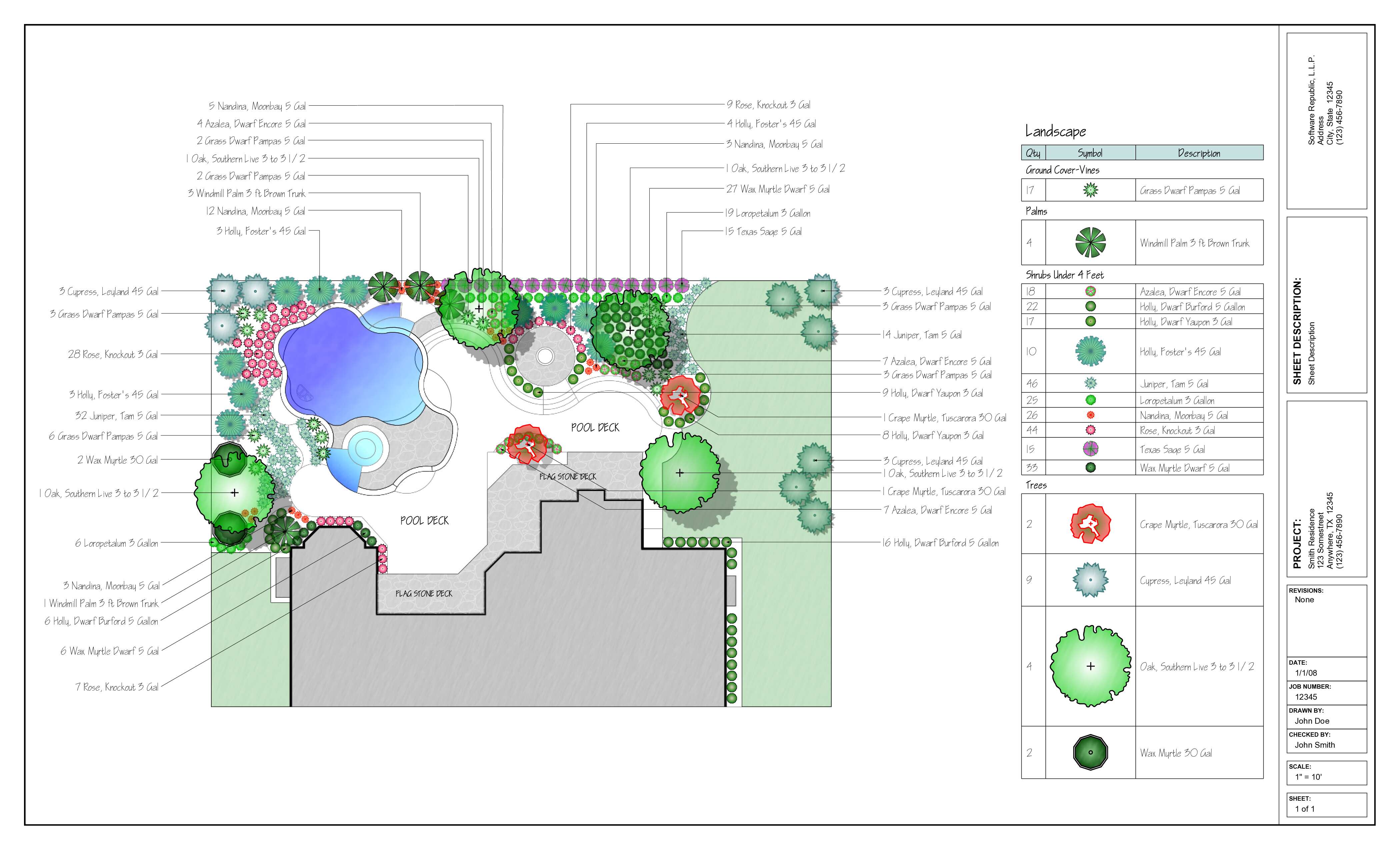 Use plant symbols, beds, notes, and quantity labels to produce professional landscape sheets clients can follow.