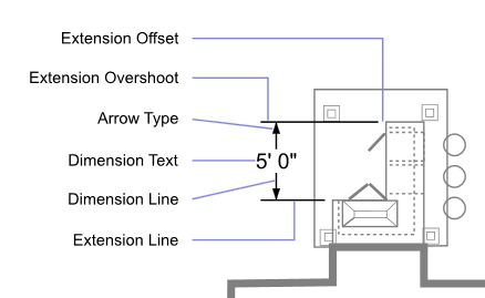 Dimensions are made up of text, dimension lines, extension lines, and arrow types. The following illustration is a diagram of the different parts of a dimension.