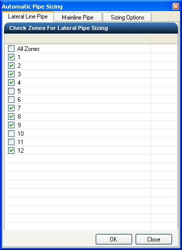 Select each zone number to size in the Check Zones for Auto Pipe Sizing box, or click on All Zones. Click on each selection with the left mouse button until a checkmark appears in the box. A zone that has not been selected will not be sized. For example, in illustration one below, the lateral line for zones 1, 2, 3, 4, 7, 8, 9 and 12 will be automatically sized. The lateral line for zones 5, 6, 10 and 11 will not be sized.
