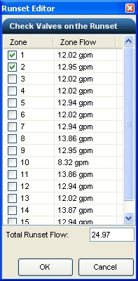 To place control valves into the Run Set, click on the desired Zone number in the list on the left side of the dialog box until a checkmark appears in the box. The flow of the selected control valves will be displayed in the Total Run Set Flow text box.